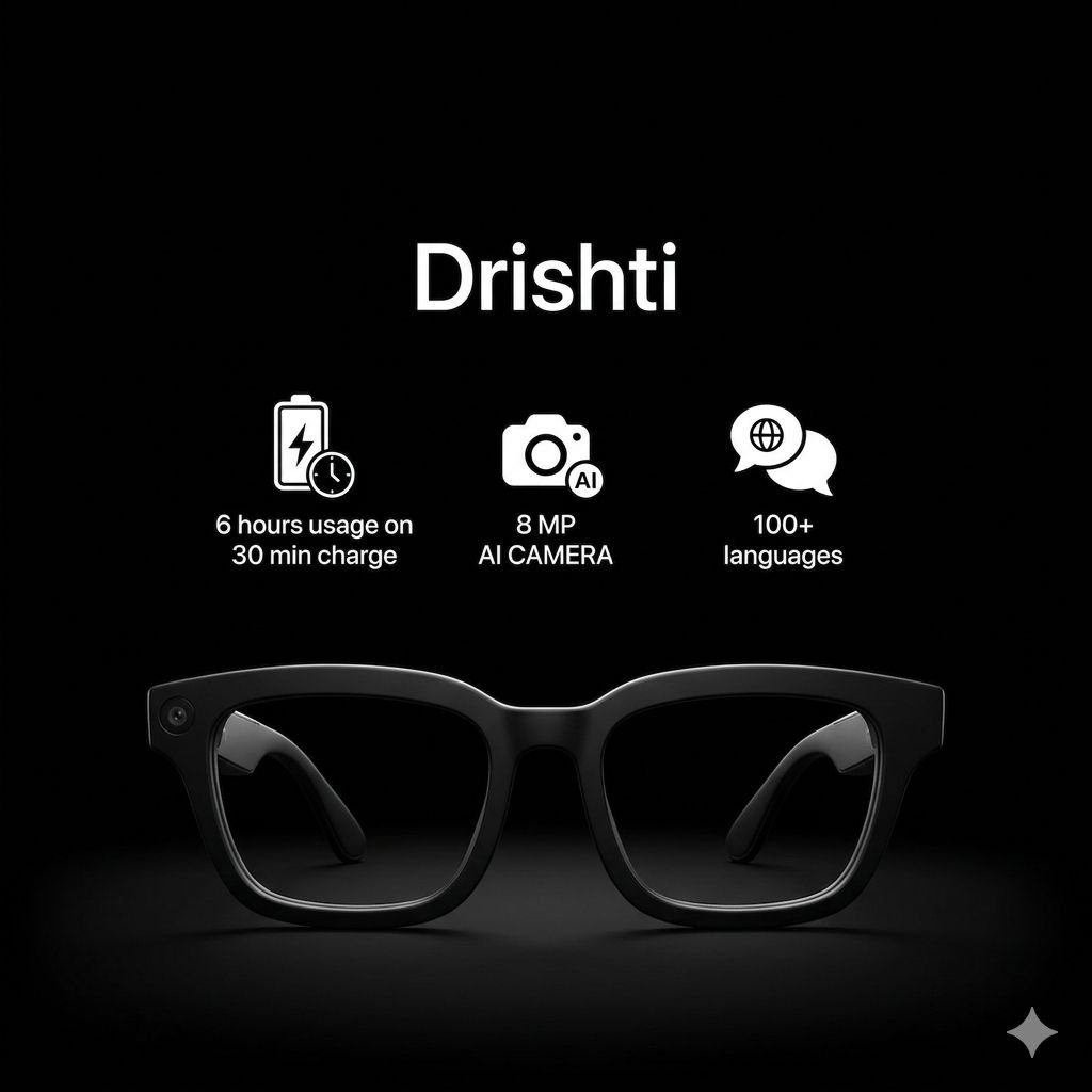 Drishti is an AI-powered smart glasses designed for the visually impaired, enabling real-time understanding of the world through audio. Equipped with a built-in 8MP AI camera, Drishti connects seamlessly to the mobile app via Bluetooth to provide instant voice feedback, object recognition, and scene understanding. Lightweight at just 49 grams, the device offers 1080p HD recording, up to 6 hours of continuous usage on a 30-minute charge, and 32GB internal storage. With support for 100+ languages, Drishti empowers users to read text, recognize surroundings, identify currency, and navigate independently with confidence.